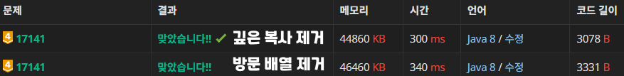 - 깊은 복사와 방문 배열 둘 다 사용했는데, 둘 중 하나만 사용하면 되었다. 그렇다면, 둘 중 어느걸 사용하는게 더 효율적일까?