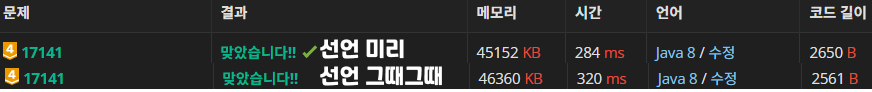 - 하지만 메모리가 큰 변수(2차원 배열)들은 미리 선언해놓는것이 좋을듯 하다.
