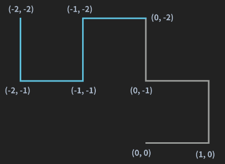 즉, K(K > 1)세대 드래곤 커브는 K-1세대 드래곤 커브를 끝 점을 기준으로 90도 시계 방향 회전 시킨 다음, 그것을 끝 점에 붙인 것이다.