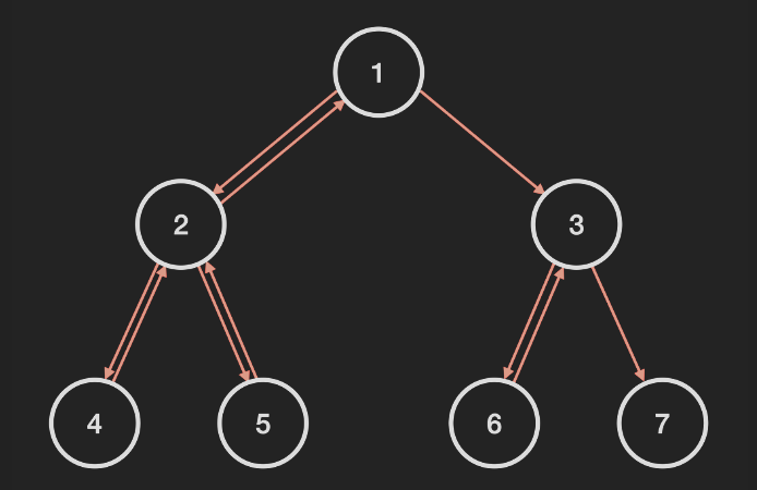 유사 중위 순회는 위 그림과 같이 루트인 노드 1에서 시작하여 노드 7에서 끝나고 1→2→4→2→5→2→1→3→6→3→7 이와 같은 순서로 순회를 진행한다. 유사 중위 순회를 진행하면서 총 10번 이동하였다.
