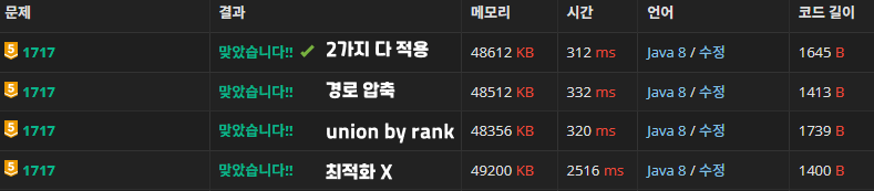 최적화하지 않은 유니온파인드보다, 최적화한 것이 훨씬 효율적이었다.